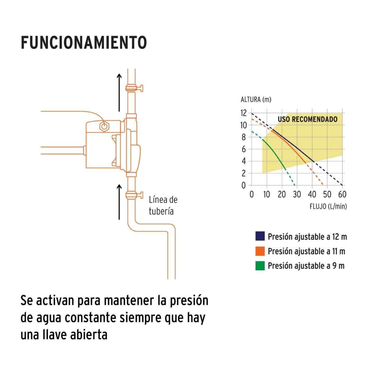 • Presión ajustable: 9 m, 11 m y 12 m
