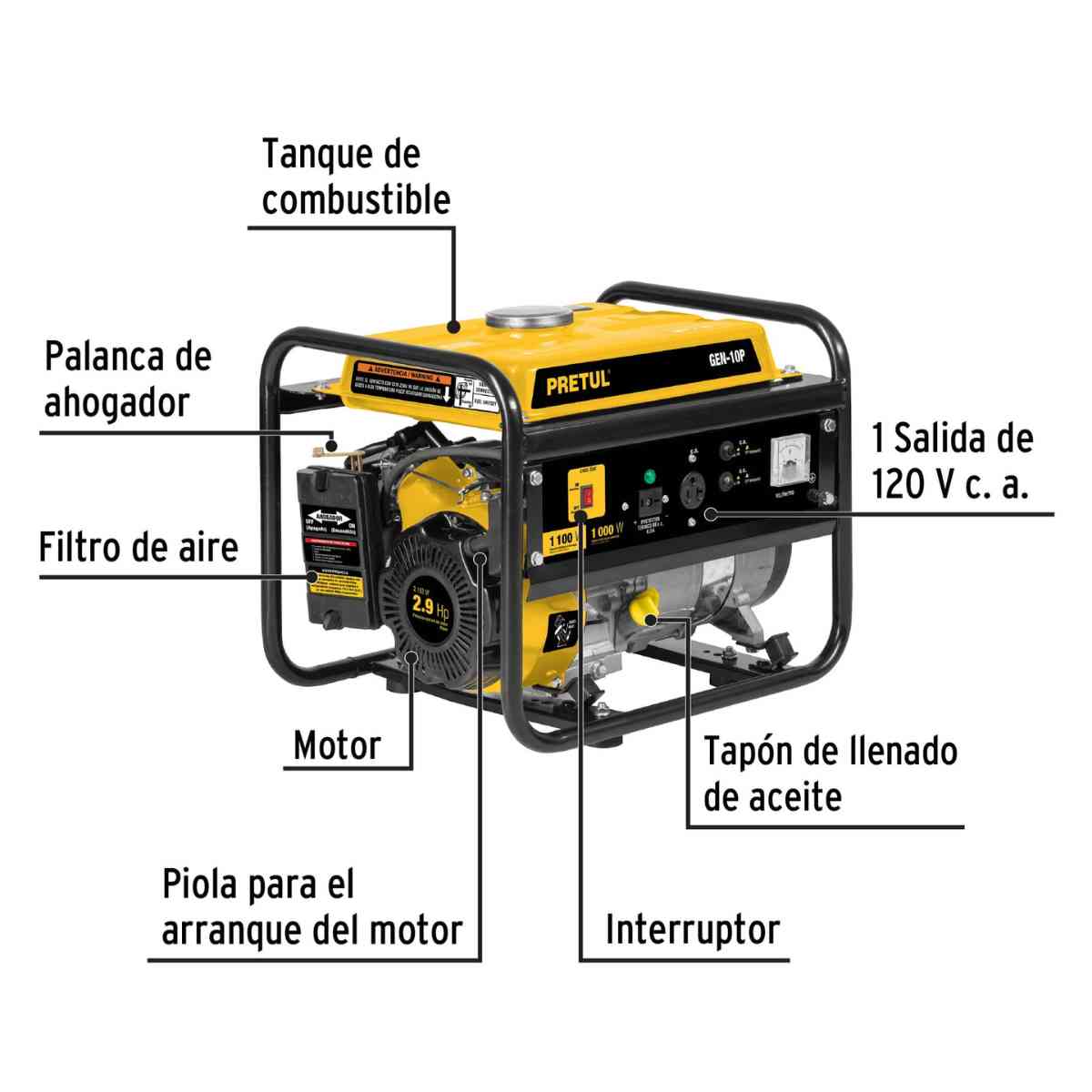 - Duración del tanque a trabajo continuo 4 h = 6 L de combustible