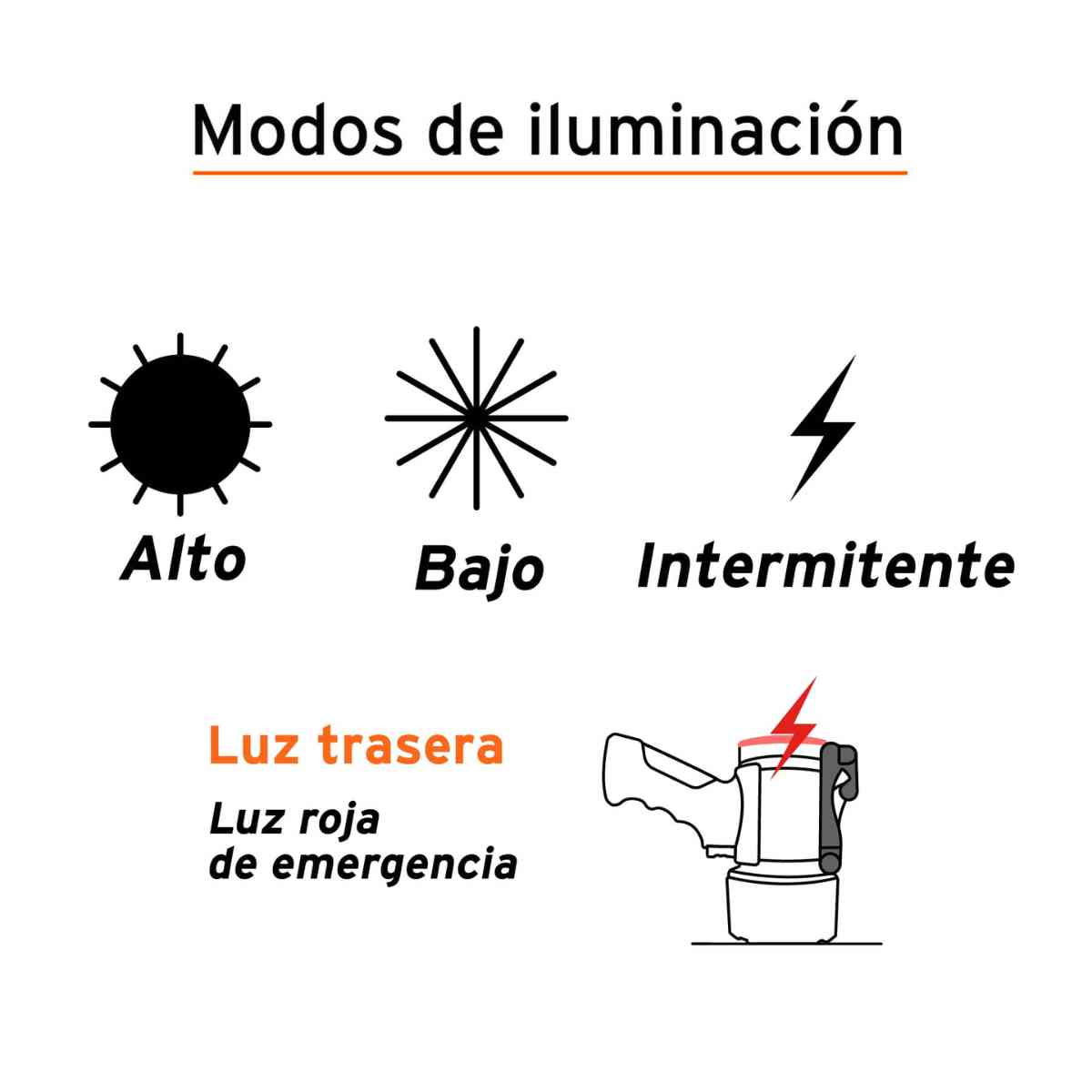 • Modos de iluminación: Alto, bajo e intermitente y roja intermitente