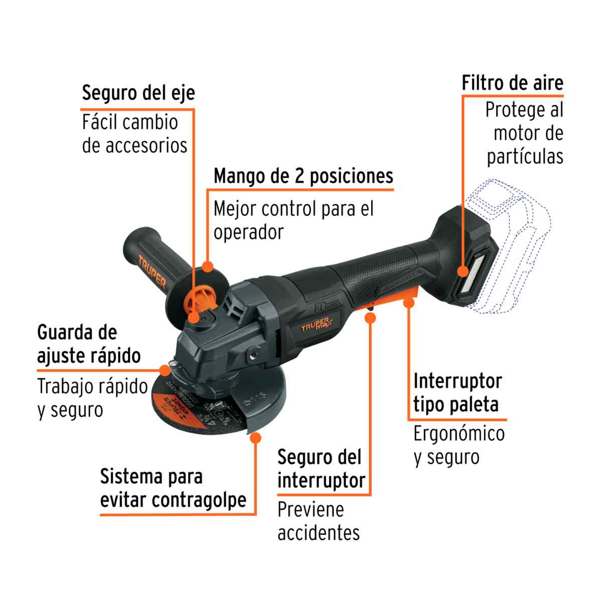• Motor libre de carbones (brushless), no requiere mantenimiento y evita el desgaste prematuro