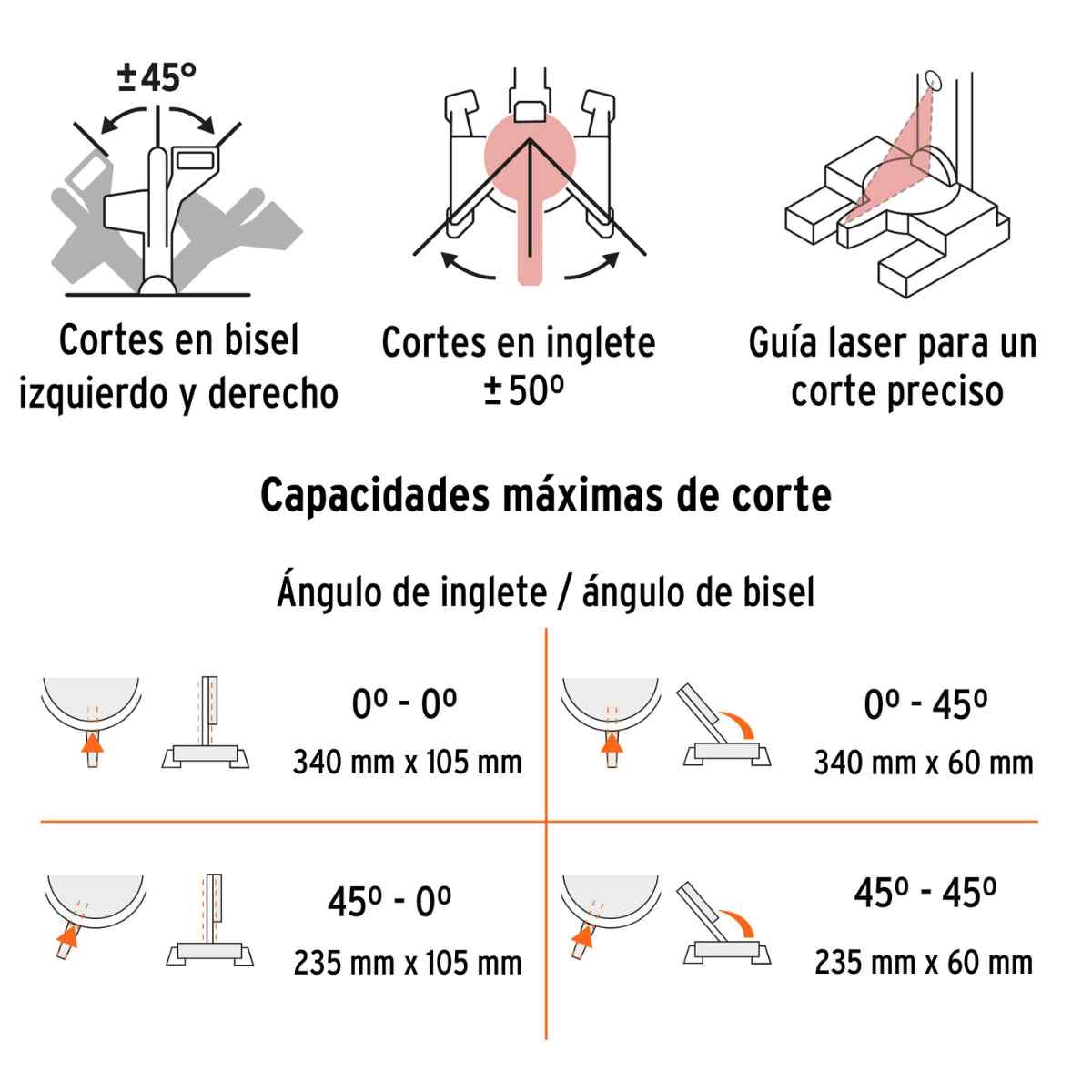 • Cortes en bisel hasta 45° (izquierdo y derecho)